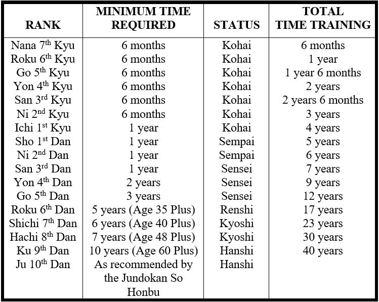 The time intervals Given are the required minimum periods. Candidates for examination must have attended 6 Dojo class sessions per month (Gasshuku will be considered), or a minimum of 36 Dojo sessions over a 6-month period.